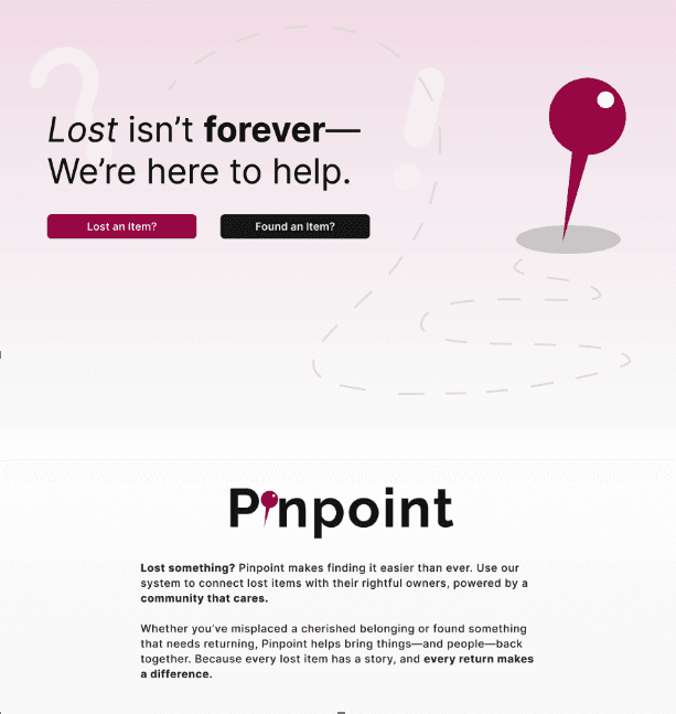 A campus-wide lost-and-found platform connecting students who've lost items with those who've found them. Unlike scattered solutions (Facebook groups, physical front desk logs, word-of-mouth), Pinpoint centralizes the experience in one searchable, categorized, and trust-enabled space.