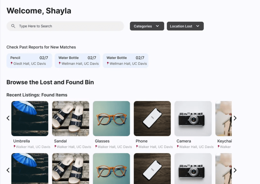 A streamlined experience where students could quickly report a lost item, search using filters that matter (category, location, value), and contact finders with confidence.
